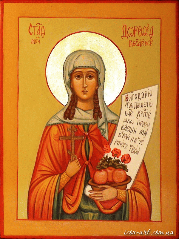 В третия век, когато християните били жестоко преследвани, живяла в гр. Кесария Кападокийска млада християнка, на име Доротея. Тя била много красива. Мъдростта й удивлявала всички, които я познавали, но особено се отличавала с християнски добродетели и с ревност към закона Господен. Тя се отказала от житейските радости и се посветила съвършено на Бога, като се стараела да Му служи с добри дела и праведен живот. Саприкий, управител на Кападокийската област, повикал на съд Доротея като християнка и започнал да я убеждава да принесе жертва на боговете, както бил заповядал царят. Девойката отговорила, че небесният Цар е заповядал да се покланят само Нему и че тя ще изпълни Неговия закон и няма да се покланя на идолите. Управителят заповядал жестоко да мъчат Доротея, но това не сломило вярата й. След това управителят измислил друго средство, за да склони Доротея да се отрече от вярата. В Кесария живеели две сестри – Христина и Калиста, които преди били християнки, но се отрекли от вярата си поради страх от мъчения. За своето отричане те получили от езичниците много пари и живеели в богатство и разкош, сред суетни удоволствия. Саприкий се надявал, че техният пример ще подействува на Доротея. Но не те подействали на Доротея, а тя ги убедила да се обърнат с покаяние към Бога и без да се съмняват в Неговото милосърдие да Го молят за прошка. Двете сестри с плач паднали при нозете на Доротея и я молили да им помогне със своите молитви. И Господ чул молитвата им и им дарувал сила да докажат на дело своето разкаяние. След няколко дни Саприкий повикал Доротея и двете сестри, но бил страшно разгневен, когато чул техния отговор: -Ние сами сме се заблуждавали, ние сами сме съгрешили, когато поради страх от мъки се отрекохме от Христа. Но Господ ни даде покаяние и ние Го молим да ни прости тежкия грях! Той веднага ги осъдил на смърт и заповядал жестоко да мъчат Доротея. Подир страшните страдания лицето на мъченицата сияело от неизказана радост. – На какво се радваш? – казал й озлобеният Саприкий. – През целия ми живот не е имало за мене по-радостен ден от днешния – отговорила мъченицата. Бог ми помогна отново да обърна към Него две души, които ти с помощта на дявола бе отвърнал от Господа. Дай ми да се порадвам и аз на небето заедно с ония, с които плаках на земята! Тогава Саприкий заповядал още да усилят мъченията на Доротея: обгаряли я с огън, били я по лицето. Най-после управителят изгубил надежда, че тя ще се отрече от вярата си и я осъдил на смърт. Когато светата мъченица чула смъртната присъда, радостно извикала: – Благодаря Ти, възлюблени мой Христе Боже, задето най-сетне ме призоваваш в Твоя небесен рай и ме въвеждаш в пресветлия Твой чертог! Там бил и Теофил, съветник на управителя, който при този радостен неин възглас извикал с подигравка към нея: „Слушай, невесто Христова, кога се настаниш в райските градини на твоя небесен Жених, изпрати ми рози и райски ябълки оттам!“ Светата мъченица отвърнала на предизвикателните му думи: „Бъди уверен, ще ти изпратя и веднага ще ги получиш! Света Доротея преклонила глава под меча и чистата й душа отлетяла при Господа. В това време, когато славната мъченица Доротея заминавала към блажения живот, при Теофил се събрали негови приятели, които той посрещнал с неудържим смях. Когато го попитали за причината на този силен смях, т