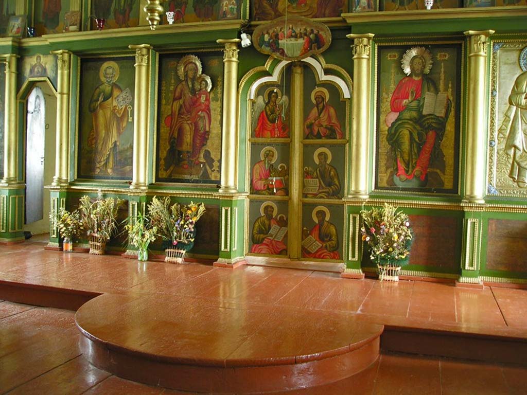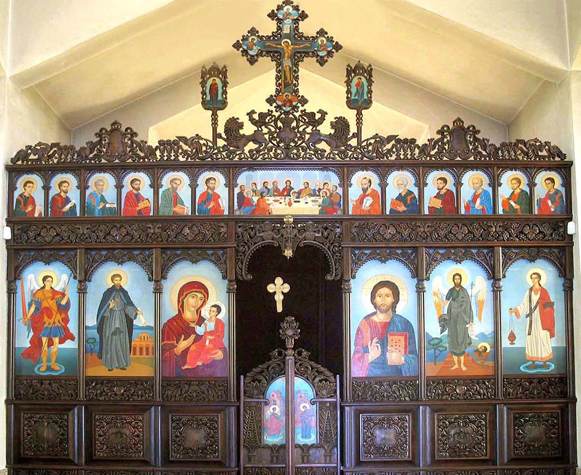 иконостас – висока преграда, отделяща олтара от средната част на храма. Обикновено украсен с няколко реда икони. Най-големите икони се наричат царски и са подредени по определен начин.