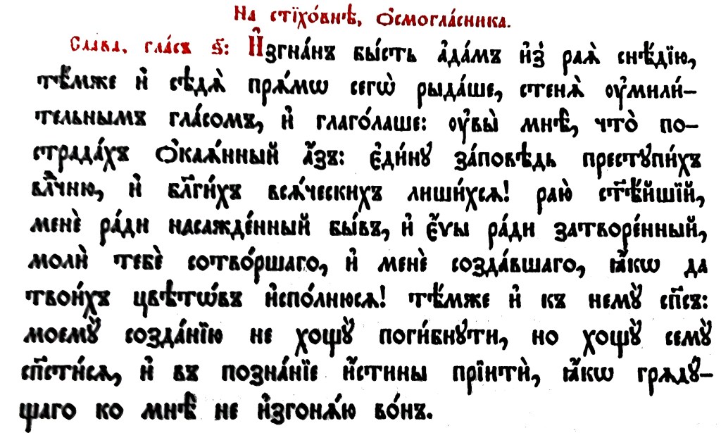 Съблазнен с храна Адам, биде изгонен от Рая и седеше срещу него и ридаеше и стенеше със съкрушен глас и казваше: горко ми, че пострадах окаяният аз: не спазих единствената Божия заповед и загубих всички блага! Раю пресветли, който заради мен си насаден и заради Ева – затворен, моли Този, Който те сътвори и ме създаде, да се изпълня с твоите цветове! Също и Спасителят му казва: не искам смъртта на моето създание, но искам всички да се спасят и да достигнат до познание на истината, защото идещия при Мен няма да изгоня вън.