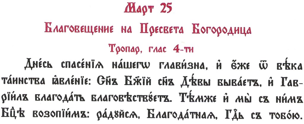 Днес е начало на нашето спасение и откриване на вечната тайна: Синът Божи става Син на Дева, и Гавриил благовести благодат. Затова и ние с него да зовем към Богородица: Радвай се благодатна, Господ е с тебе!