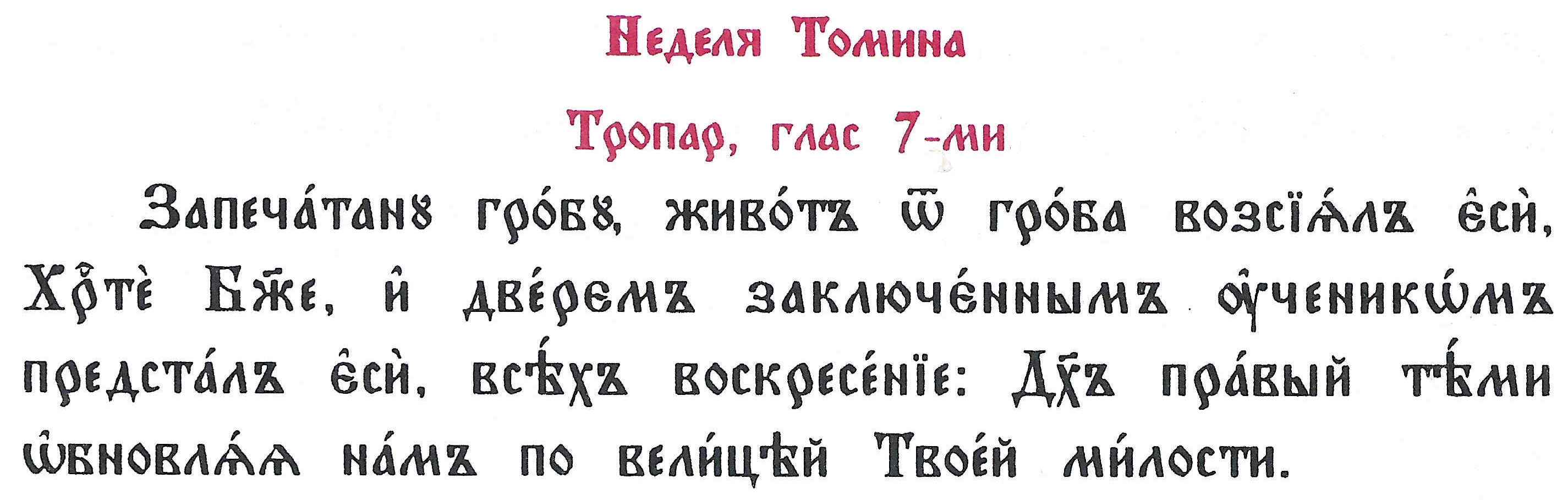 Макар да беше запечатан гробът, Ти Животе, Христе Боже, Възкресение на всички, от гроба възсия, и при заключени врати застана пред учениците, като чрез тях ни даде истинския Дух, по Твоята велика милост.