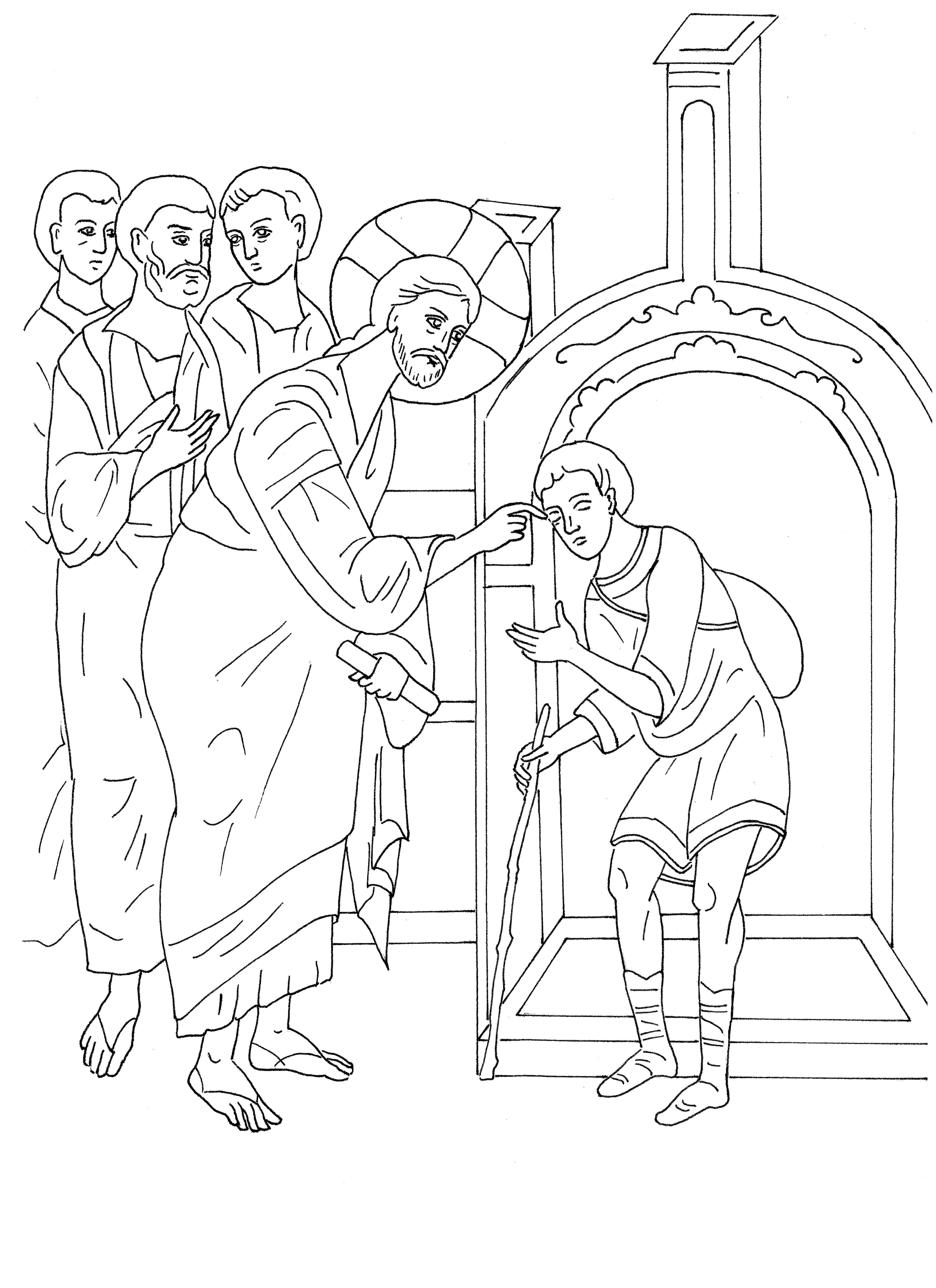 Задача: Запознайте се с иконата, изобразяваща изцелението на слепородения и се опитайте да разкажете тази библейска история. Оцветете приложението.