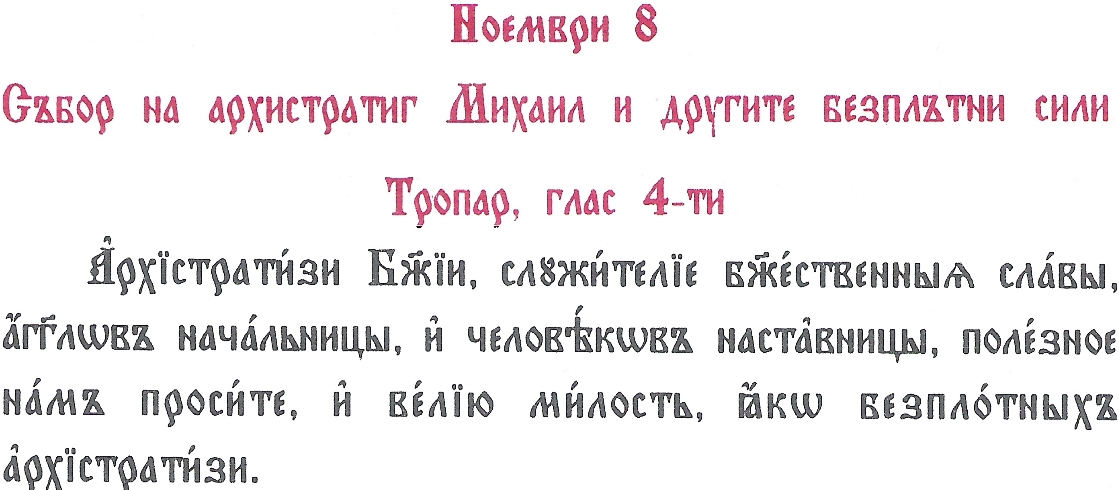 Военачалници Божии, служители на Божествената слава, предводители на ангелите и наставници на човеците, измолете полезното за нас и велика милост, защото сте военачалници на безплътните сили.