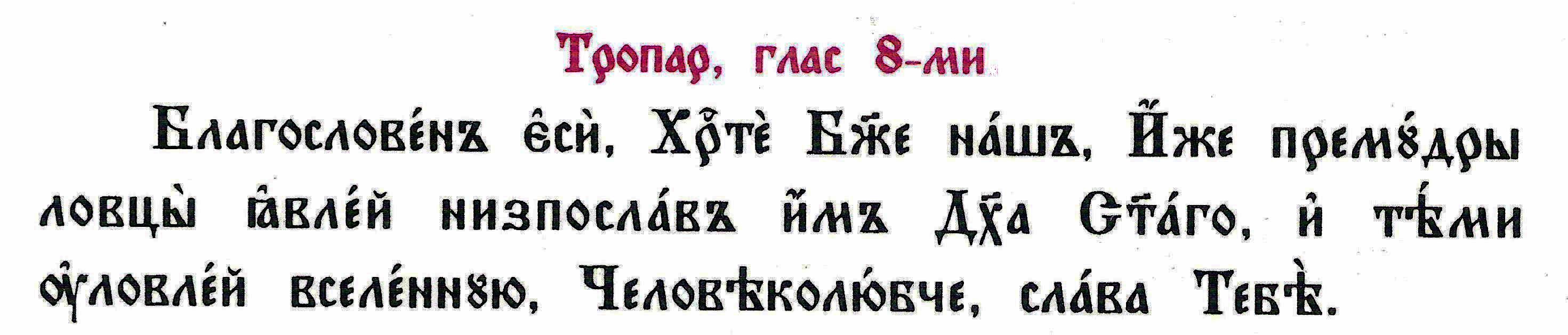 Благословен си, Христе, Боже наш, Който показа рибарите премъдри, като им прати Светия Дух и чрез тях улови света, Човеколюбче, слава на Тебе!
