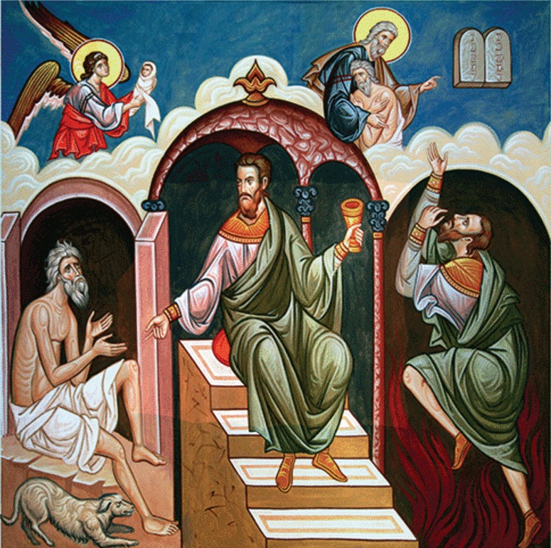 Умря сиромахът, и занесоха го Ангелите в лоното Авраамово, умря и богаташът, и го погребаха, и в ада, когато беше на мъки, подигна очите си, видя Авраама отдалеч и Лазаря в лоното му и, като извика, рече: Отче Аврааме, смили се над мене, и прати Лазаря да намокри края на пръста си във вода и да ми разхлади езика, защото се мъча в тоя пламък.