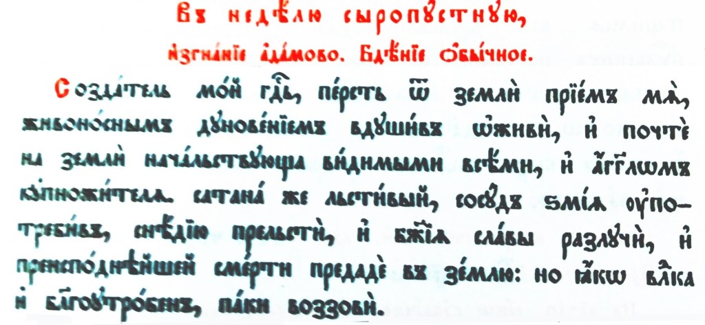 Господ, моят Създател, взе мен от земна пръст и ме оживи като вдъхна в мен жизнено дихание и ме удостои да властвам над всичко видимо на земята и да съжителствам с ангелите. Но коварният сатана, като използва змията, ме съблазни с храна и ме разлъчи от Божията слава и ме предаде на смърт адова в земята; но като Владика и добросърдечен пак ме призови.