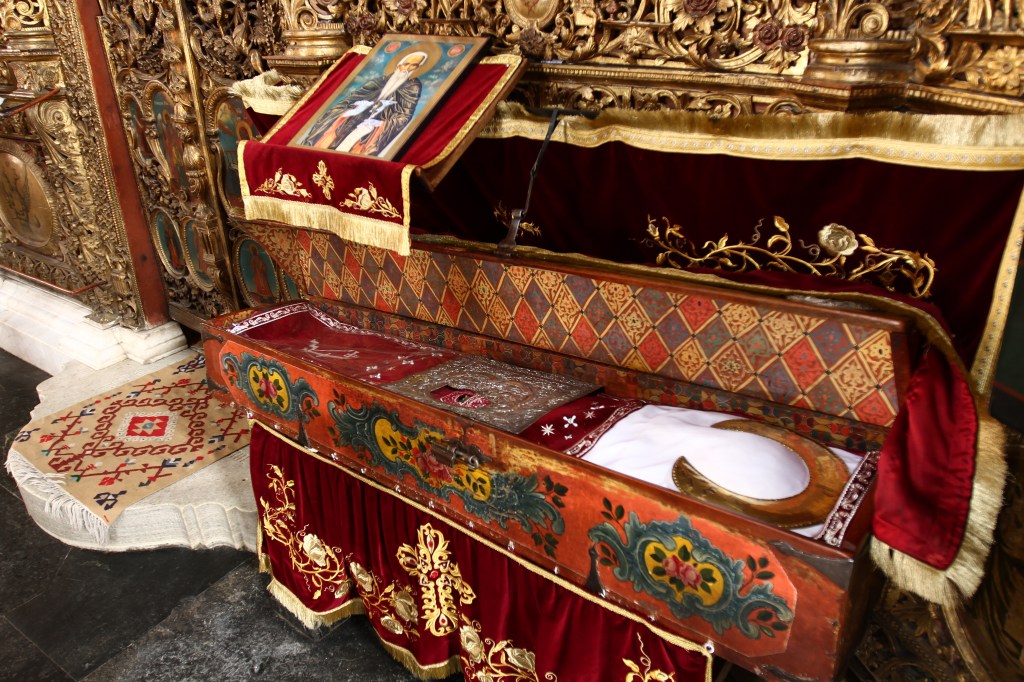 (2) Гробът на св. Йоан Рилски е в църквичката под пещерата, където е пребивавал. Мощите са днес пред иконостаса на главния храм, под иконата на Спасителя.