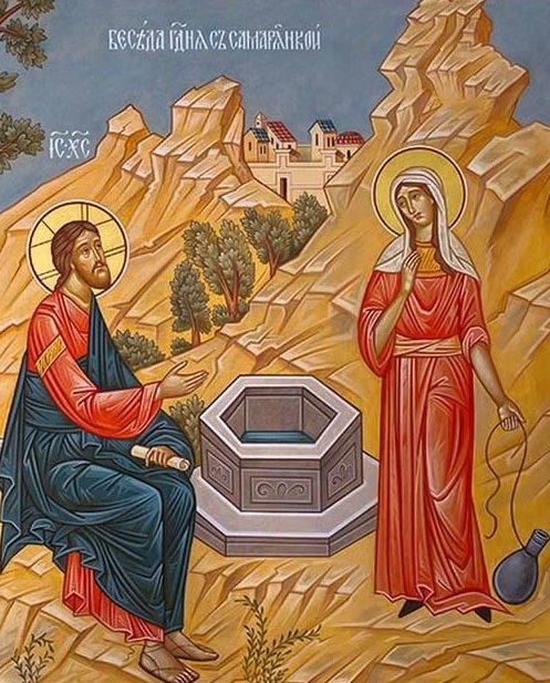 И тъй, дохожда Господ в самарийския град, наричан Сихар, близо до землището, което Иаков бе дал на сина си Йосифа. Там беше Иакововият извор. Уморен прочее от път, Иисус седеше си тъй при извора. Часът беше около шестия. Дохожда една жена от Самария да си начерпи вода.