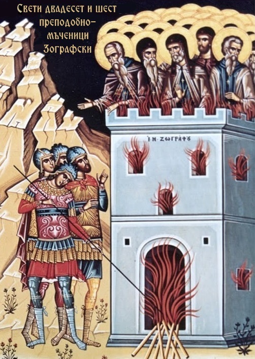 https://vseh-svjatih.blogspot.com Има възпоменания в дни на мъченици, които са по-показателни, по-знакови за една или друга епоха. Честваните на 10 октомври 26 Зографски преподобномъченици са знакови за нашето време на съглашателства, компромиси и политическа дипломация, прехвърлена в църковното поле. Отстояването на православието срещу западните нововъведения и заблуди показва високия духовен ръст на зографските монаси, които отхвърлят приетата, по политически причини, от императорския двор уния и защитават чистотата на вярата с живота си. Тяхната кончина е най-яркият пример за принципната невъзможност на заличаване на най-същностни различия, противни на Христовото учение – нещо, което в днешно време хора на модерните „вярващи“ е съгласен да пренебрегне. Ето и тяхното житие, както е изложено в „Жития на светиите“ изд. “Св.вмчк Георги Зограф“, 2001, с.287-290. Добавяме и историческия текст „Мъчение на Зографските монаси“, Стара българска литература т.4, с.283-285 със съответните текстово-критически бележки. Този текст е в основата на днешното житие, поместен е в сборник с други жития от 16 век, произхождащ от Света Гора, но е писан в края на 13 век. Ръкописът му сега е в Москва, ГБЛ, сбирка на Григорович, №1706.